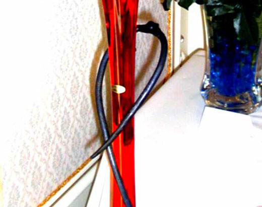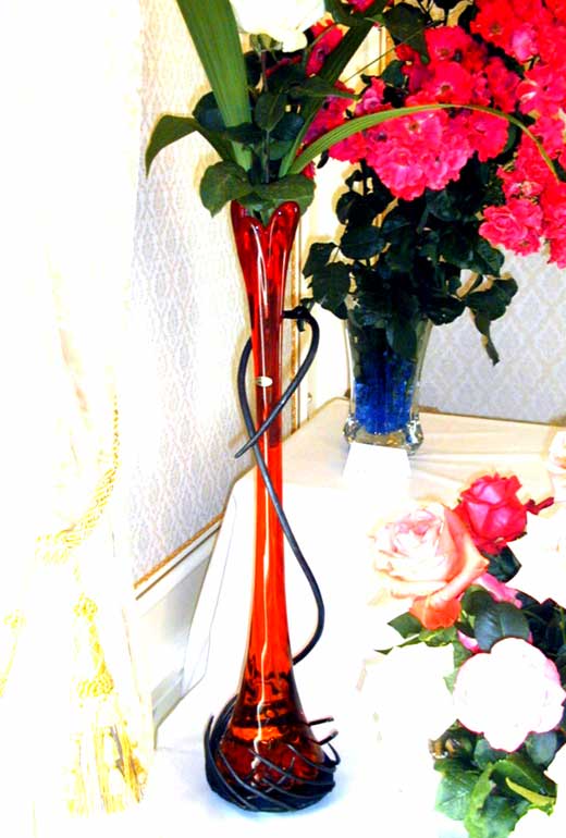 毎年恒例の萬翆荘バラ展で使用する為に依頼を受けて製作致しました。琉球ガラスの花器が背が高いので転倒防止と花器のアクセントということで製作しました。アイアンとガラスの相性は抜群ですのでとても落ち着いた感じに仕上がったのではないでしょうか。花器の取り外しが出来るようにという事で、写真ではわかりにくいと思いますが上にのびた蔓状の金物が開閉できるようになっております。それと今回は塗料を使用せずに蜜蝋だけで仕上げてみました。鉄の持つ重厚な感じがより引き立っているのではないでしょうか!