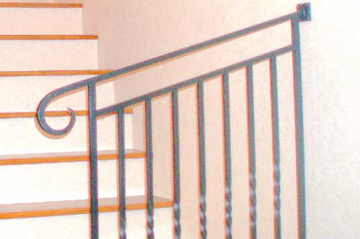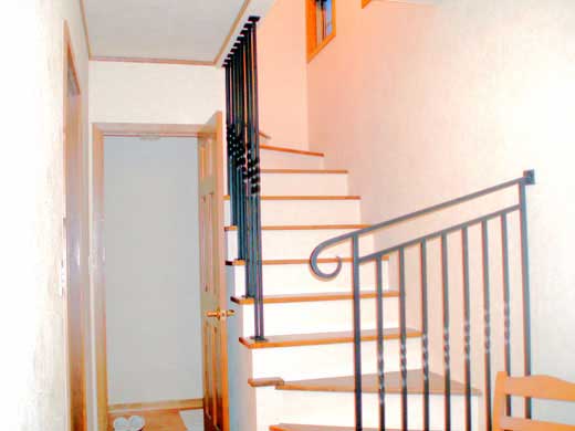 これも住宅メーカーさんから製作を依頼されたロートアイアンの階段手摺りです。デザインはメーカー様持ち込みでこのようなタイプでとう事で製作いたしました。こちらもシンプルな形をお客様が希望と言う事でツイストバーのみの構成となっております。立て格子につきましてもツイストバーのみシンプルな感じに仕上がっております。!